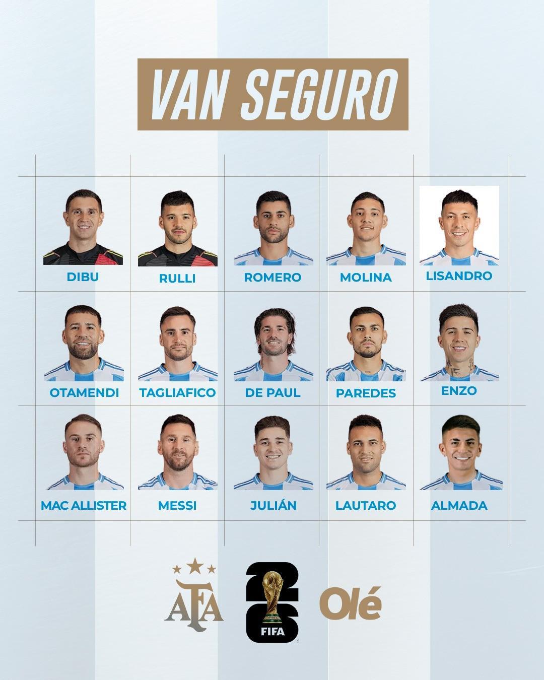《奥莱报》认为,有15名球员如无意外将会铁定入选阿根廷国家队明年世界杯的参赛名单,这15名球员分别是:门将达米安-马丁内斯和鲁利,后卫克里斯蒂安-罗梅罗、莫利纳、利桑德罗-马丁内斯、奥塔门迪、塔利亚菲科,中场德保罗、帕雷德斯、恩佐-费尔南德斯、麦卡利斯特,前锋梅西、胡利安-阿尔瓦雷斯、劳塔罗以及蒂亚戈-阿尔马达。